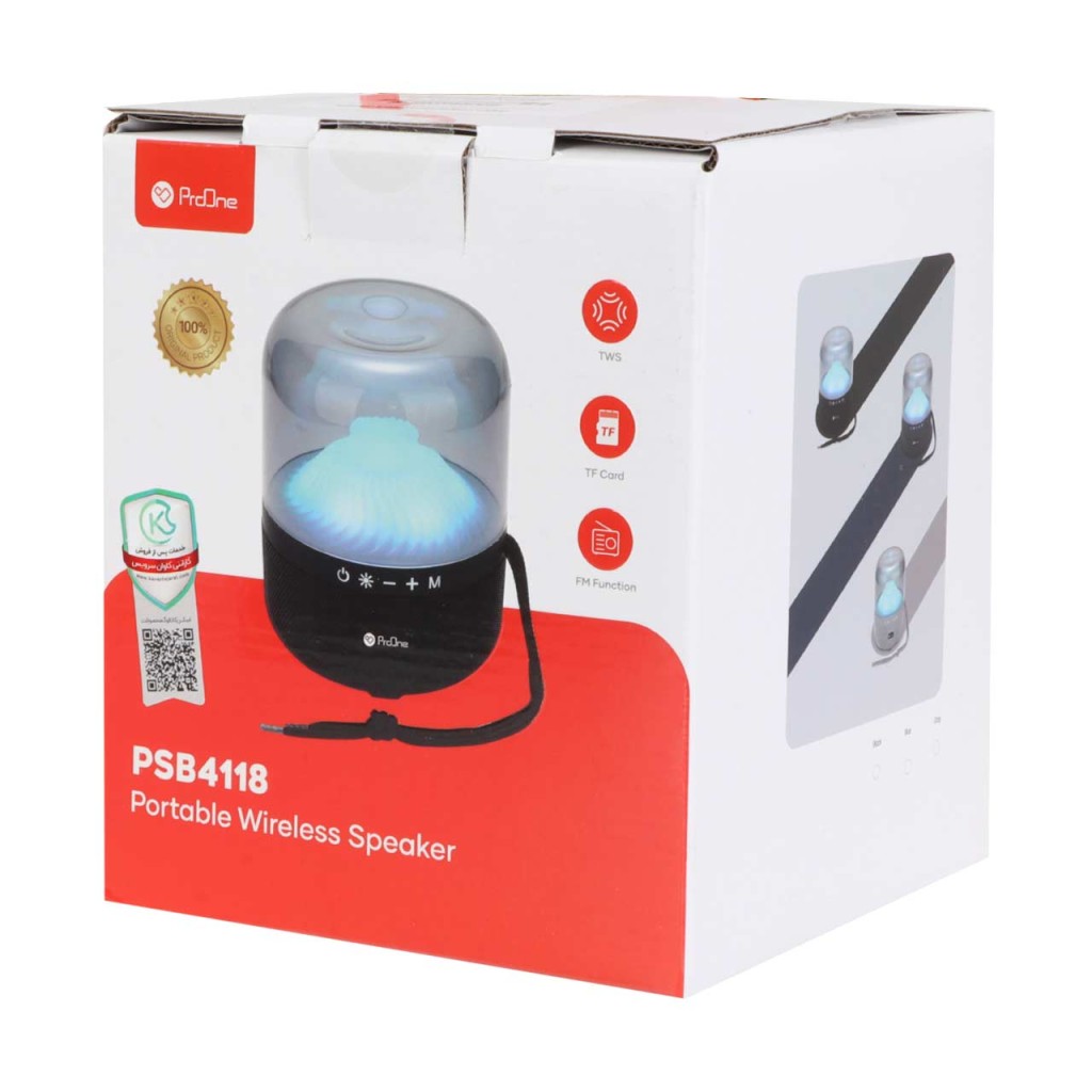 اسپیکر ProOne PSB4118 یک اسپیکر قابل حمل همهکاره با طراحی مدرن و امکانات گسترده است که برای استفاده در خانه، مهمانیها و فضای باز مناسب است. این مدل از اتصالات چندگانه شامل بلوتوث 5.1 با برد حدود ۱۰ متر، ورودی AUX، USB و پشتیبانی از کارت حافظه TF برخوردار است که امکان پخش موسیقی از منابع مختلف را فراهم میکند.